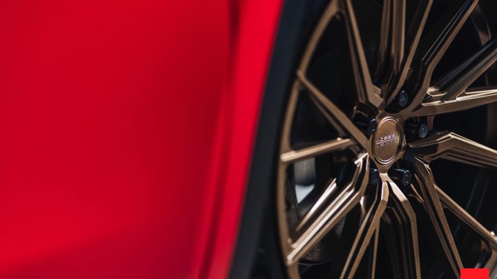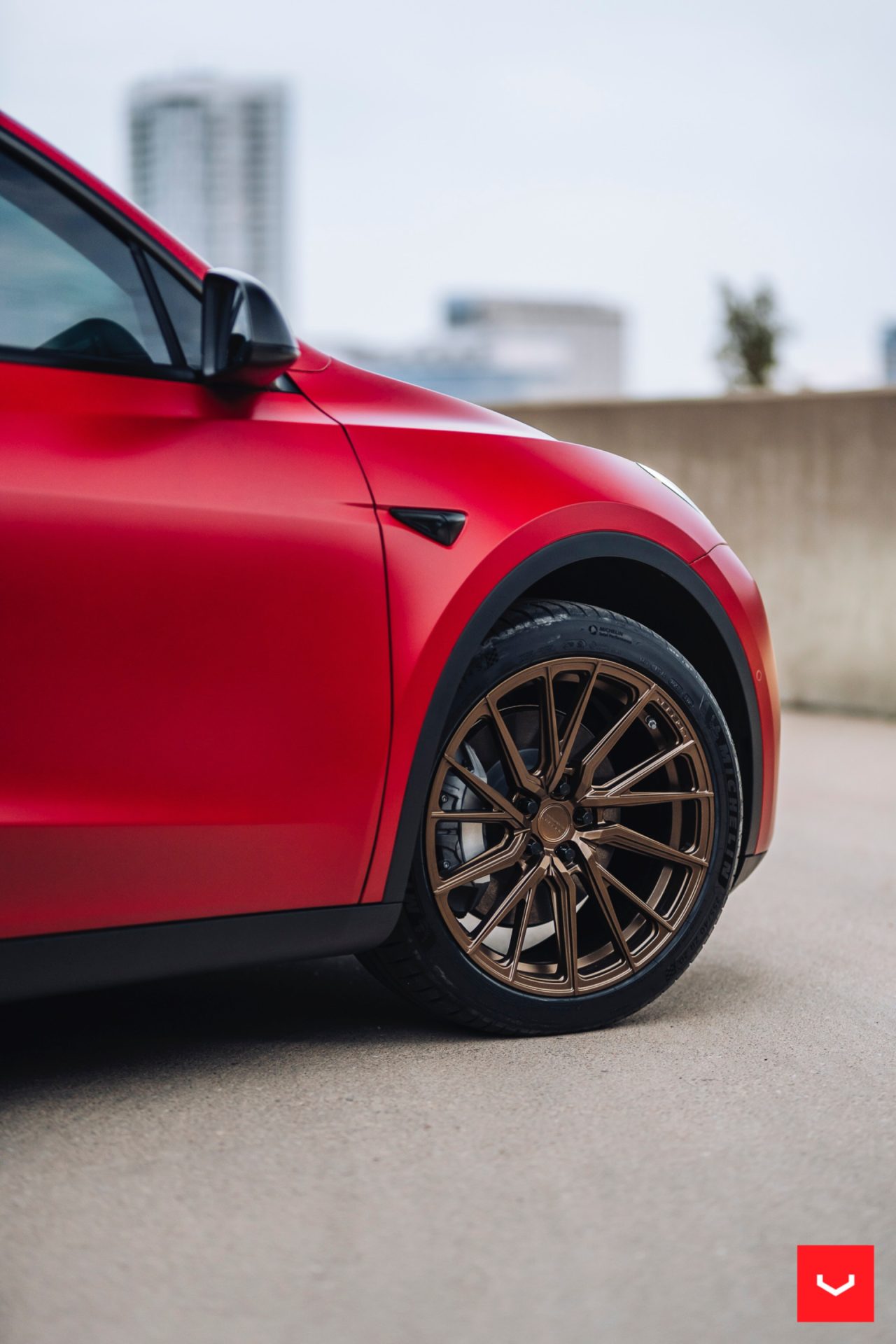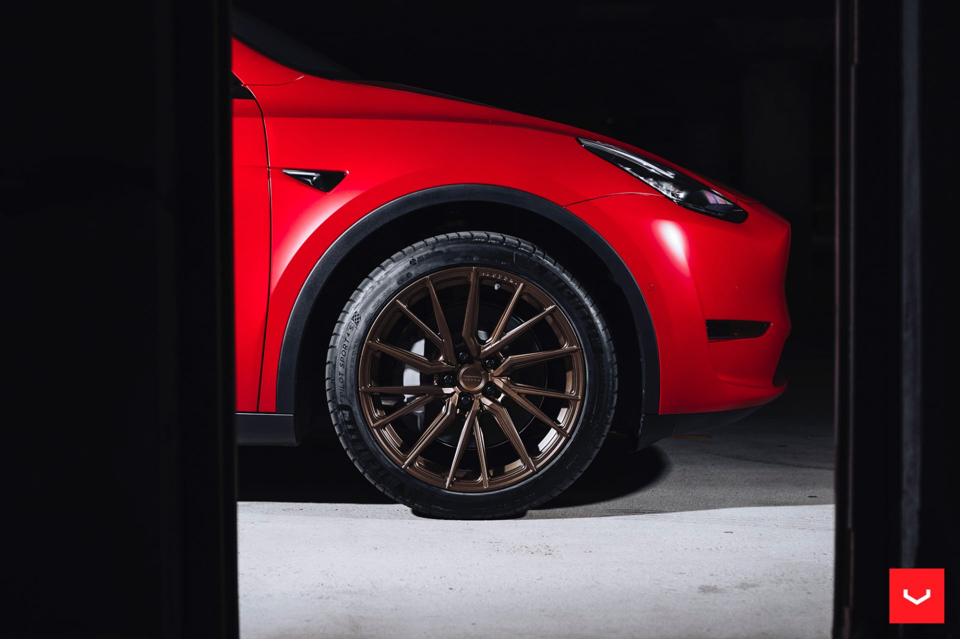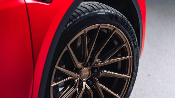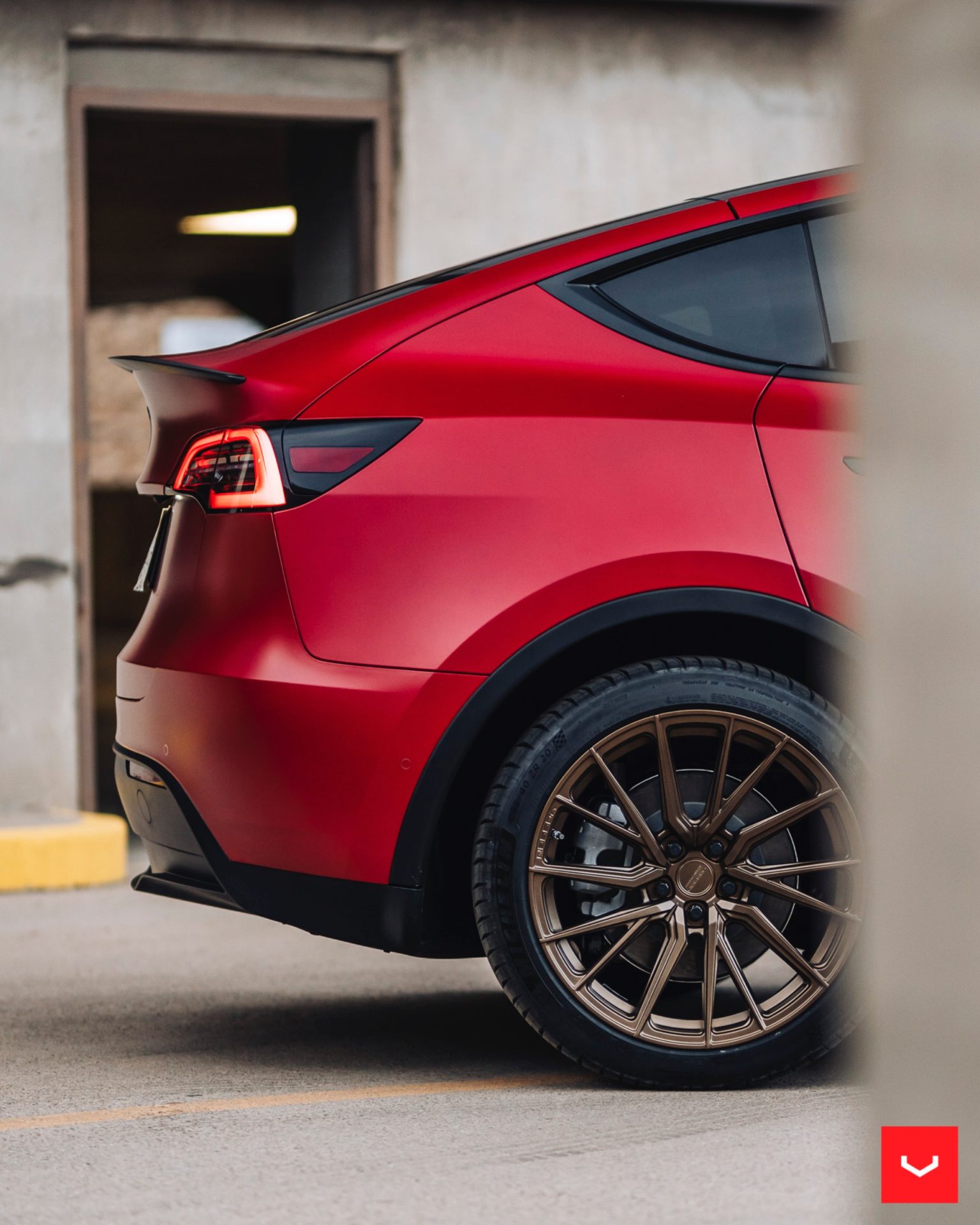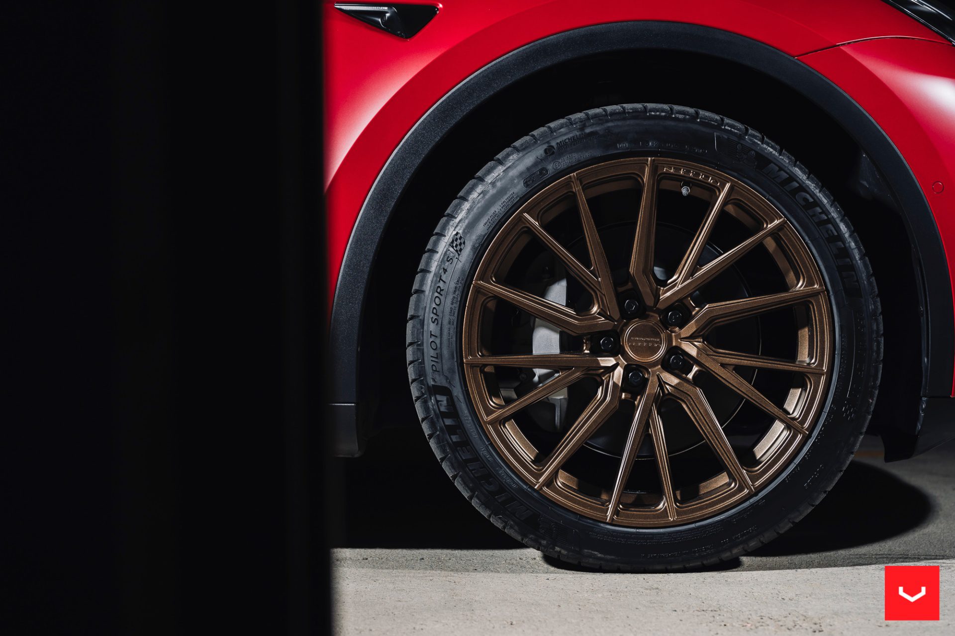 Red Tesla Model Y – Vossen HF-4T Wheels in Satin Bronze
