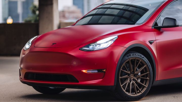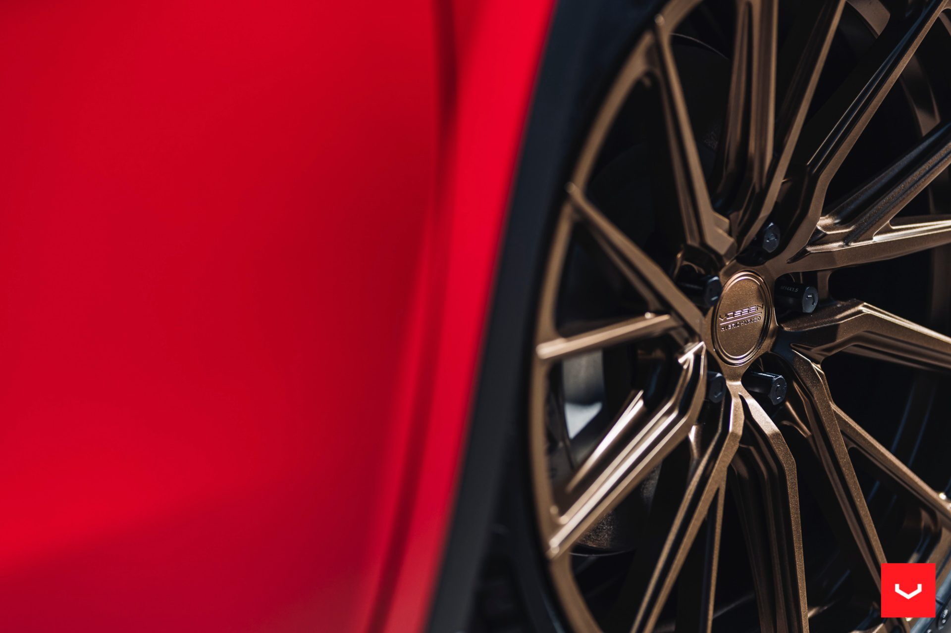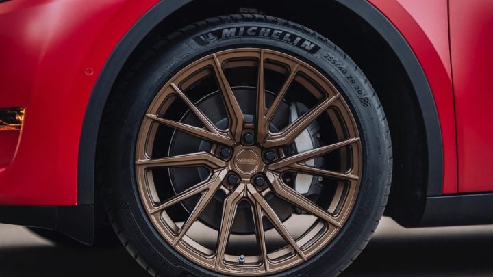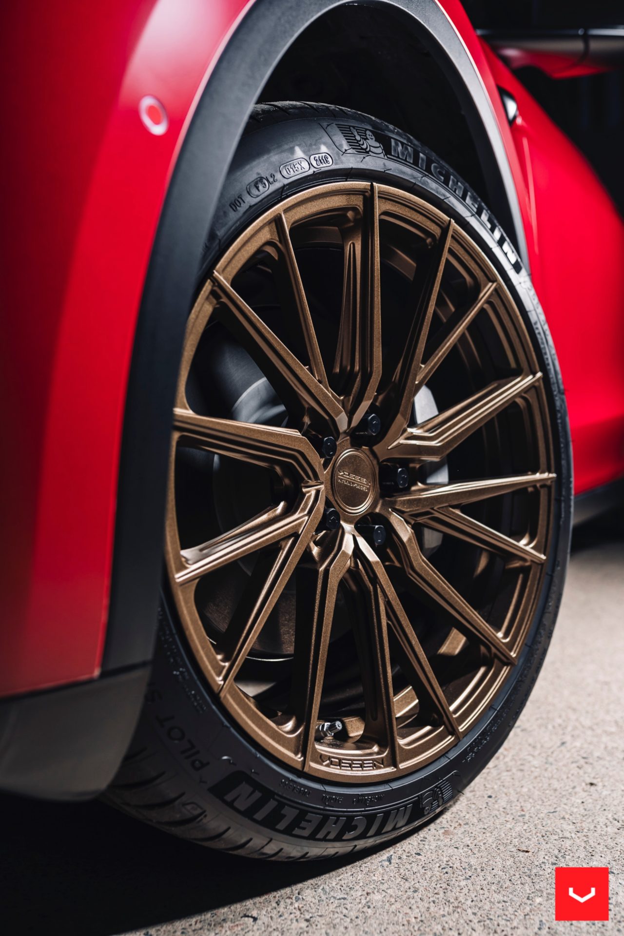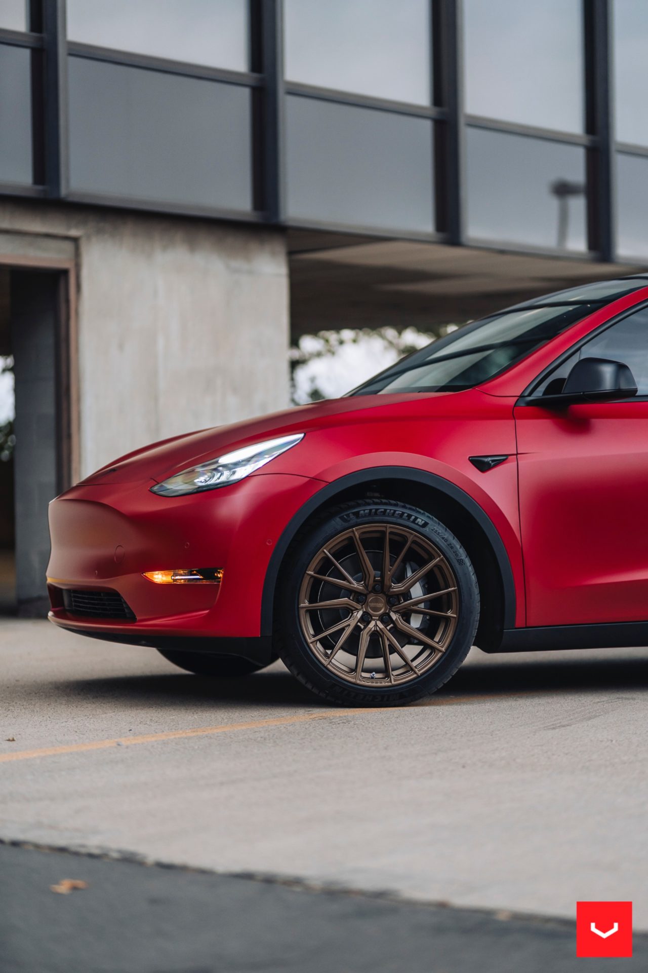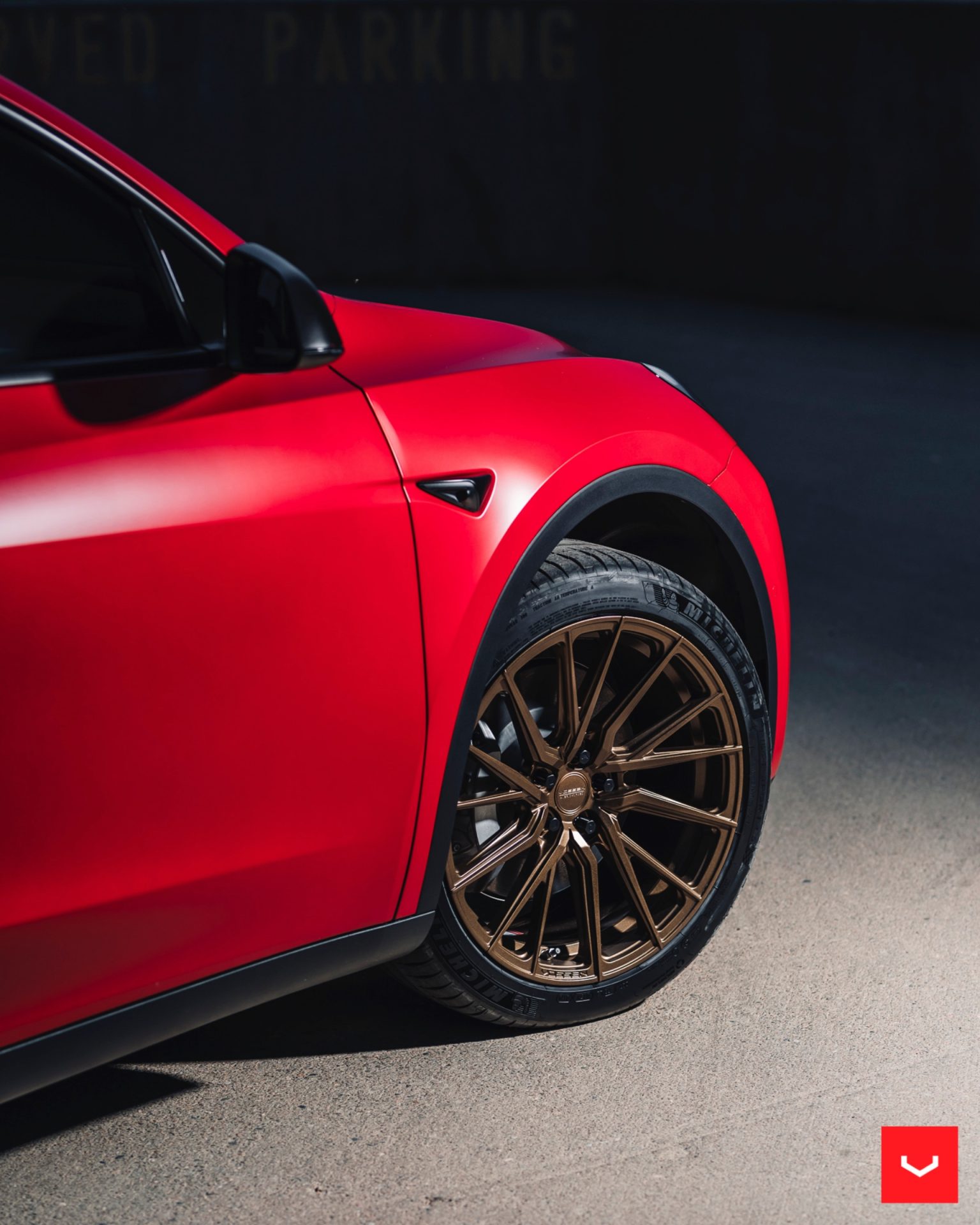 Red Tesla Model Y – Vossen HF-4T Wheels in Satin Bronze
