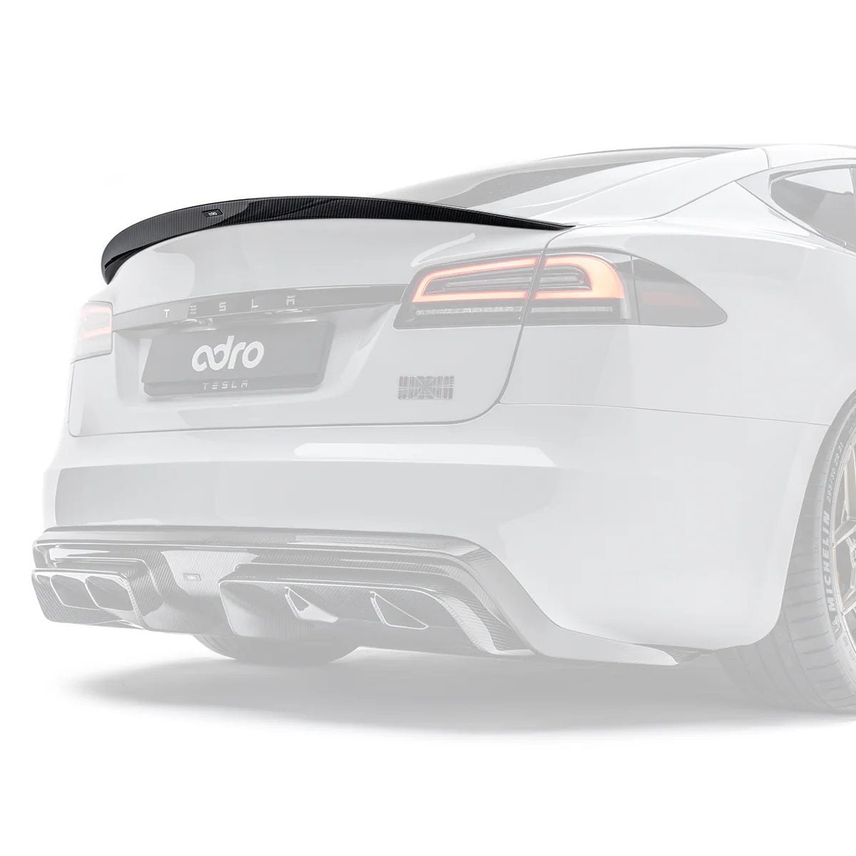 The ADRO Carbon Rear Spoiler for the Tesla Model S enhances high-speed stability by managing rear airflow while adding a bold, performance-inspired aesthetic. Made from lightweight prepreg carbon fiber, it blends seamlessly with the factory design for a refined yet aggressive upgrade.