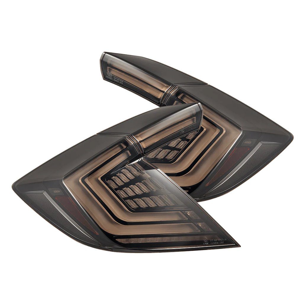 AlphaRex introduces the 10th-gen Honda Civic Hatchback NOVA-Series Prismatic LED Tail Lights, a groundbreaking innovation incorporating prism optics technology to enhance both aesthetics and functionality for the Civic FK. These tail lights feature dual LED tubes that serve as red parking lights, with trapezoidal prisms in the center creating a modern 3D effect during the day, while also functioning as red brake lights. Positioned at the ends of each dual LED tube, two prisms provide white LED reverse lights for optimal visibility in low-light conditions. Additionally, a clear LED bar at the bottom offers flexibility, functioning as either a sequential or blinking amber turn signal. Designed to seamlessly integrate with Civic FK hatchback models, the NOVA-Series Prismatic LED Tail Lights elevate the contemporary look of the 10th-gen Honda Civic while delivering advanced lighting performance.