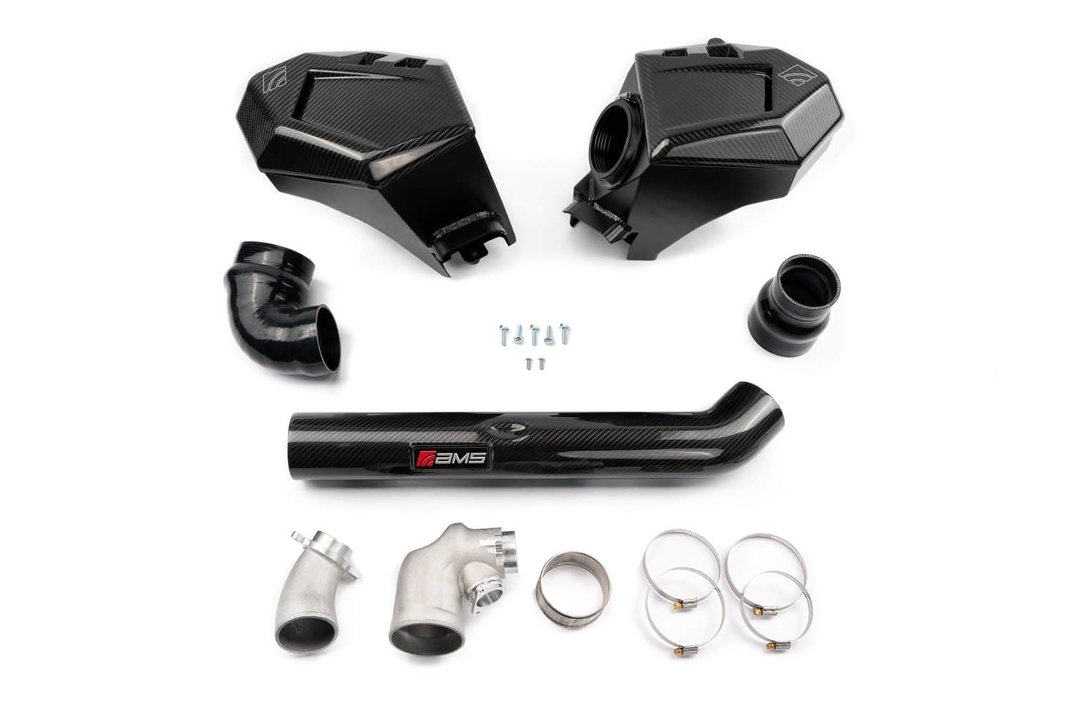 AMS Performance developed the Carbon Lid Intake Kit for the G8x BMW M2, M3, and M4 to deliver exceptional power gains, faster throttle response, and a refined induction experience for the twin-turbocharged S58 engine. Central to the system is a massive 3.5″ carbon fiber intake tube and smooth-flowing 4-ply silicone couplers, working together to channel unrestricted airflow into the turbos. The oversized cast aluminum turbo inlet elbows — measuring up to 128% larger than stock — provide a direct, high-volume path to the compressor wheels for maximum efficiency. A defining feature of this kit is the bespoke carbon fiber lids; fully enclosed, autoclave-cured, and precisely contoured to shield intake temperatures while offering a bold motorsport-inspired aesthetic under the hood. These lids not only enhance thermal insulation and reduce heat soak, but also contribute to a sharper, more resonant induction sound. Proven on the dyno to generate up to +86whp peak and +66whp on average above 5000rpm, the AMS intake system significantly widens the powerband. With dry filter elements for long-term reliability and simple upkeep, and precision fitment for hassle-free installation, this kit reflects AMS Performance’s dedication to high-performance carbon fiber innovation.