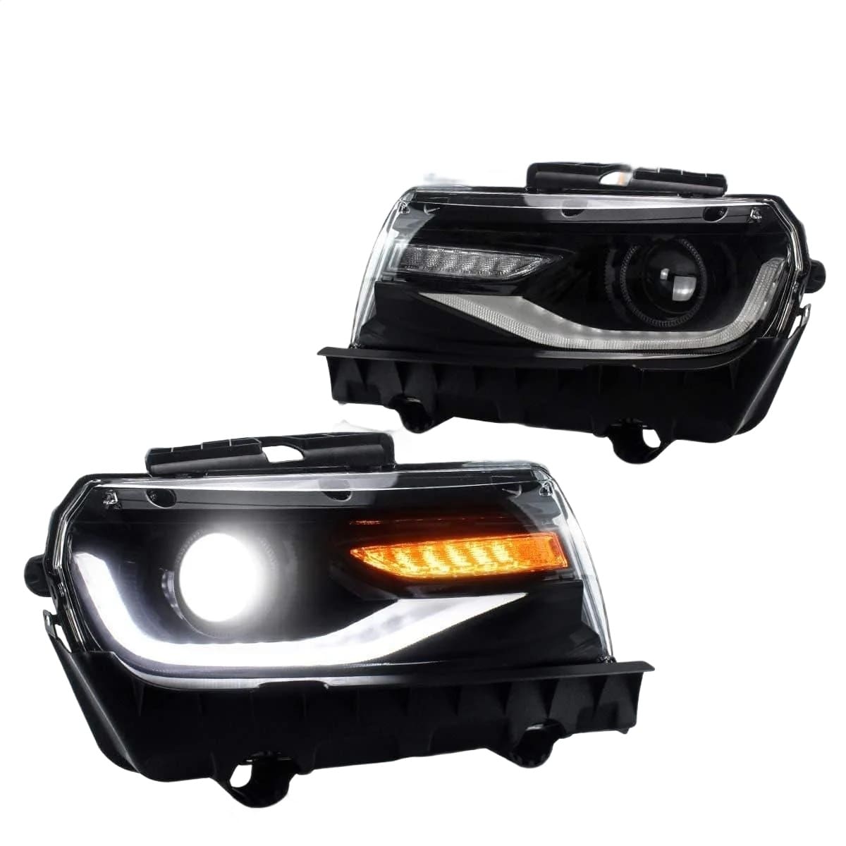 The Auto Addict 6th Gen Projector Headlights with LED DRL are direct-fit, modern upgrade headlights for 2014-2015 facelift Camaro LS, LT, RS, and SS models that enhance the front-end appearance with projector lenses and sleek LED daytime running lights, perfectly complementing ZL1-style conversions.