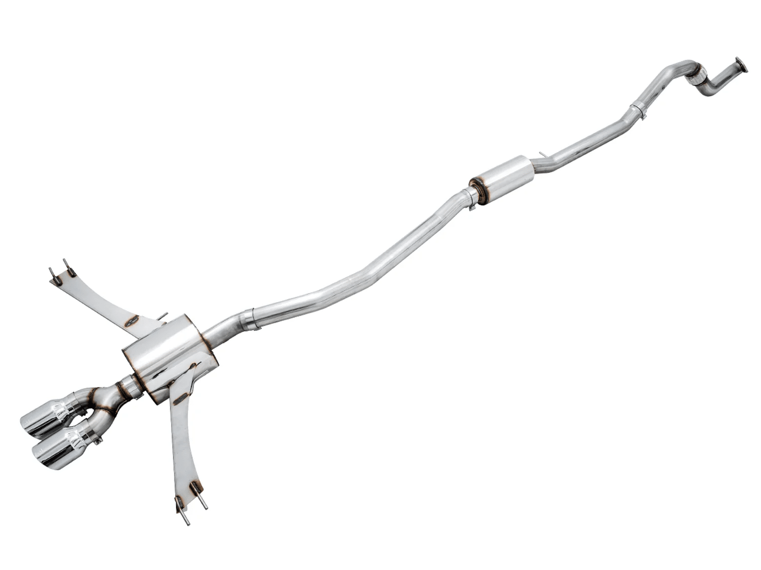 The AWE Tuning Touring Edition Exhaust with Front Pipe and Dual Chrome Silver Tips is designed, engineered, and manufactured in-house at AWE in the USA, handcrafted from 3″ CNC mandrel-bent T304L stainless steel with .065″ wall thickness sourced domestically. The clean, straight-through design keeps airflow unrestricted, and the system installs as a direct bolt-on with no cutting or modification needed. The modular tip design is worth noting; it allows easy interchangeability between dual and tri tip configurations, so the look of the rear of the car can be changed without swapping the whole system. The bespoke stamped stainless steel trident tip merge ties the rear end together, and max gains come in at 6 hp and 1 ft-lb of torque at the wheels.