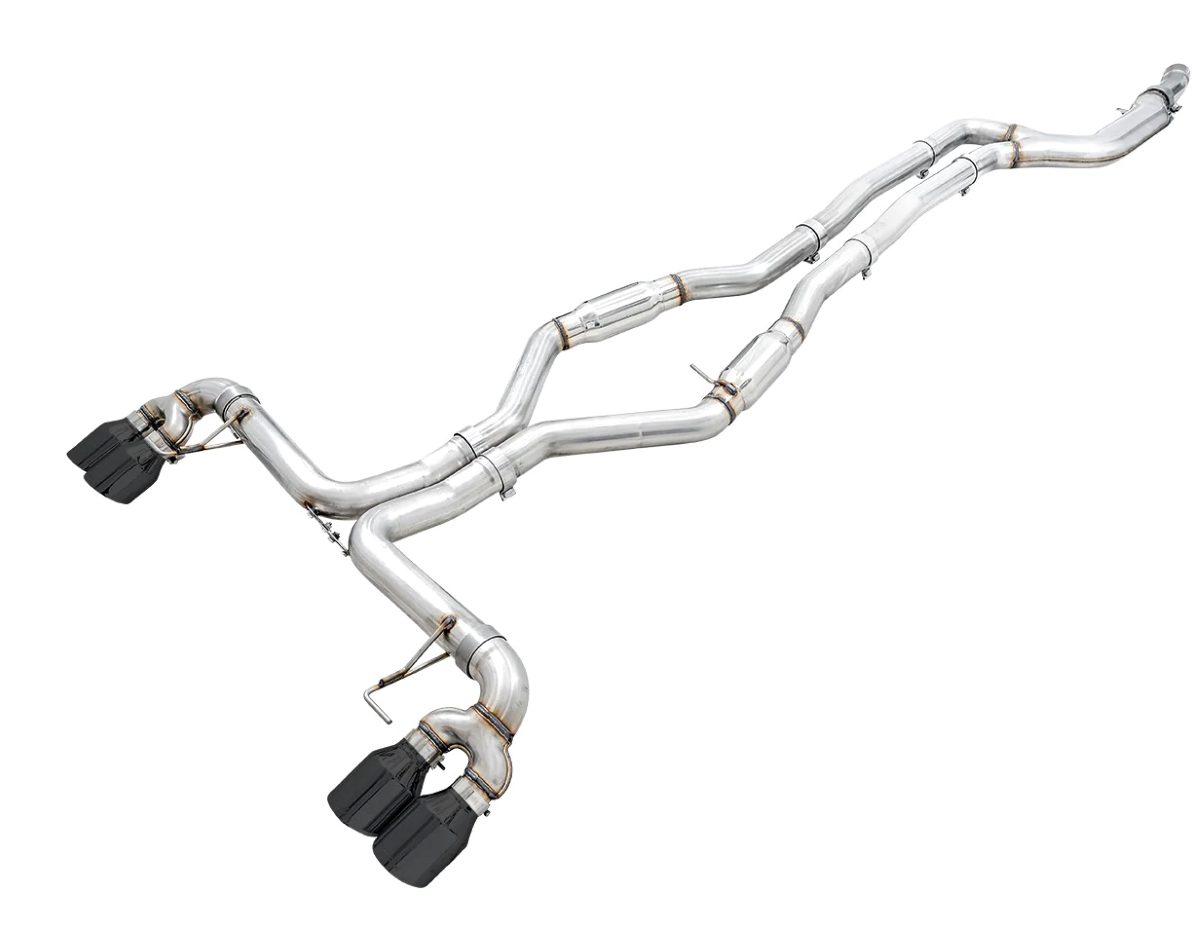 The AWE Track Edition Exhaust for the G2X BMW M340i and BMW M440i removes the Touring Edition’s sound-smoothing elements in favor of straight-through sections, allowing the B58 inline-six to express a more direct and aggressive character. The system produces a louder, sharper tone under throttle and during spirited driving, with more pronounced growl on cold starts and higher RPMs, while still maintaining usable balance at lower speeds. The quad diamond black tips give the rear a purposeful, understated appearance that integrates cleanly with the factory valance. Constructed from T304L stainless steel and engineered as a direct bolt-on, the Track Edition prioritizes raw exhaust sound and airflow while retaining compatibility with the factory valve system, making it a practical choice for enthusiasts who want a more engaging and performance-oriented auditory experience.