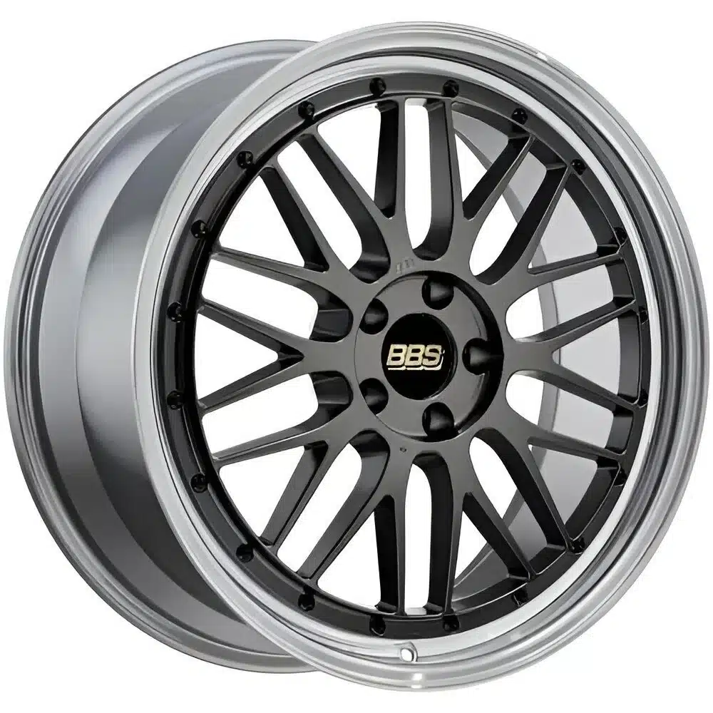 The LM from BBS is a two-piece forged wheel combining classic mesh styling with modern engineering, offering low weight, high strength, and precise handling, with a diamond black finish and silver diamond-cut lip that emphasize craftsmanship and enduring motorsport heritage.