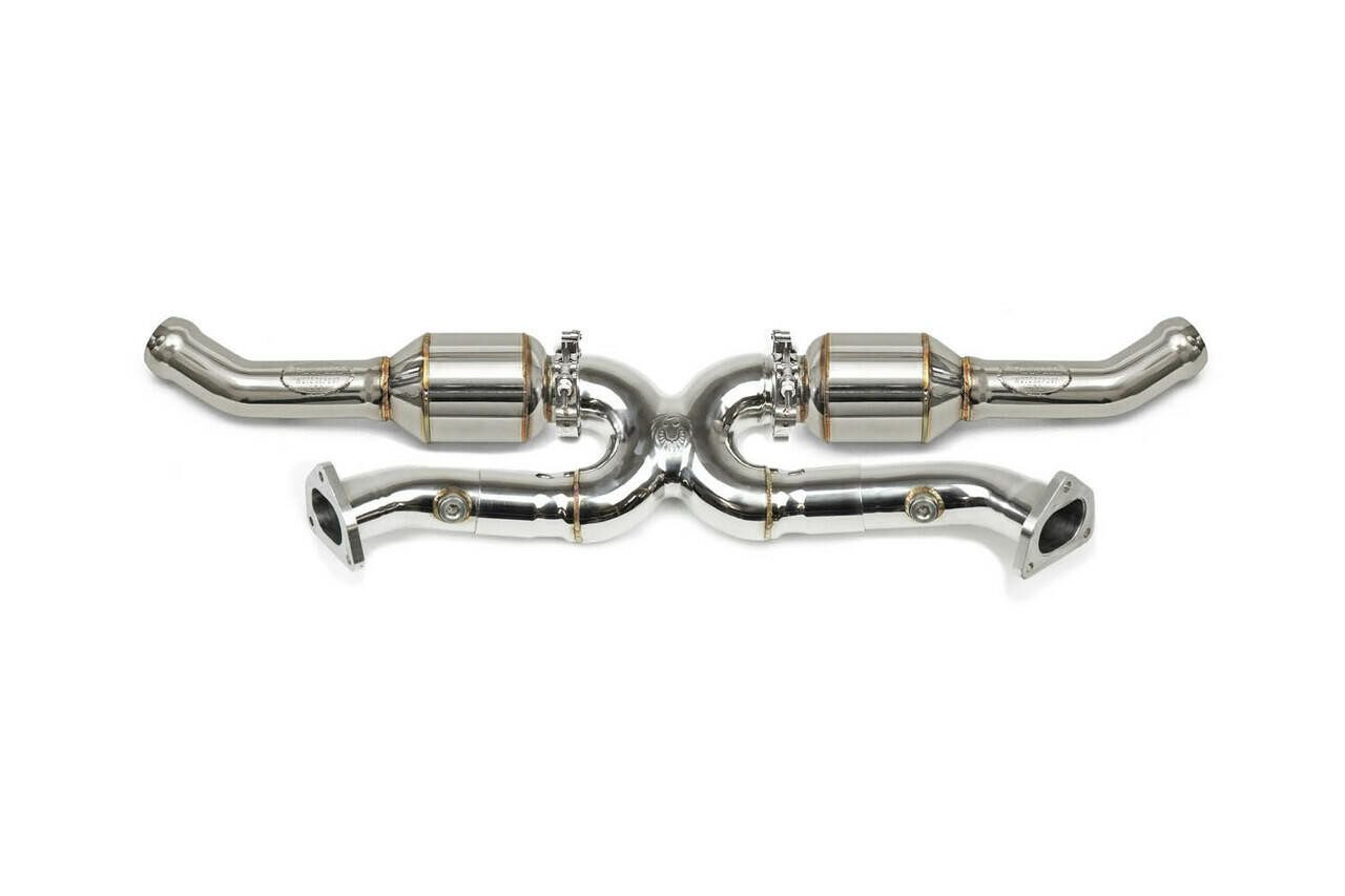 This high performance X-Pipe replaces the factory equipment with 200-cell HJS German Imported Sport Cats for improved power and sound. By optimizing air flow, your Carrera will sound and perform even better than it already does. With free flowing cats and an investment cast X-Pipe this system will give a nice increase in volume while also smoothing out the exhaust note of your flat 6. The sports car sound is much better and higher pitched with no resonance and no droning.