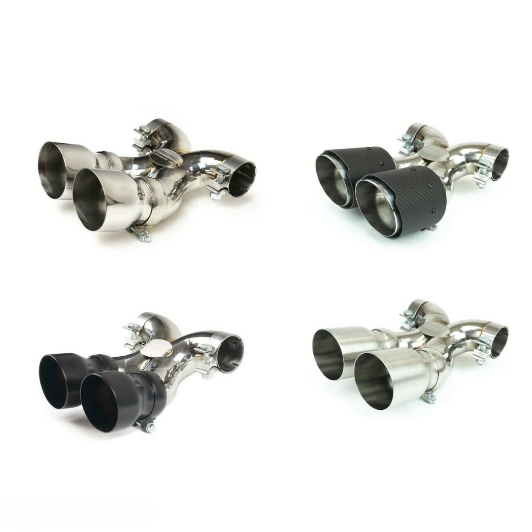 The Fabspeed Maxflo True X-Pipe with Dual Tips for the Porsche 982 Boxster & Cayman is the perfect bolt-on upgrade to enhance both performance and aesthetics. The factory Porsche OEM exhaust tips direct exhaust gases at each other, causing them to collide and create resistance as they exit through the tips. Fabspeed’s premium Maxflo X-pipe design, the only true X-pipe available, allows exhaust gases to exit the factory mufflers more efficiently, increasing velocity, smoothing out sound, and providing a noticeable boost in power and exhaust volume. Additionally, the dual tips offer a sporty visual enhancement, with four different finishes available to suit personal preferences.