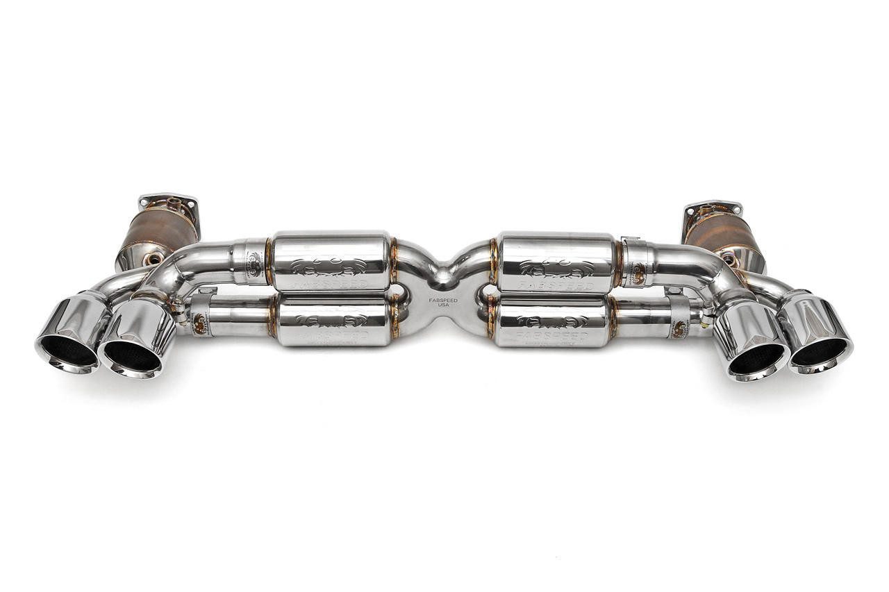 Fabspeed Motorsport offers a high-performance x-pipe equipped with HJS German HD 200 CPSI sport cats and tips, providing enhanced power and exceptional sound. Featuring 200-cell HJS sport cats and deluxe quad-style tips, this ultimate performance system boasts 70mm 2.75″ CNC mandrel bent tubing and straight-through resonators for maximum power and an exhilarating x-pipe sports car sound. Fabspeed engineers have meticulously tested various sizes and found that anything smaller or larger than 70mm 2.75″ compromises power and causes excessive drone. With over 1100hp capability and a high-pitched sound, the 70mm 2.75″ round tubing offers the perfect solution.