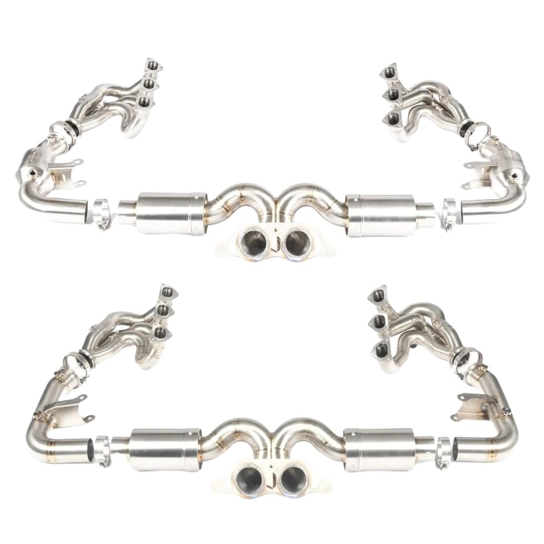 The JCR Non-Valved Superlight Race Exhaust System & Manifold Assembly for the 991.2 Porsche 911 GT3 RS (with OPF) / Speedster is engineered for maximum performance, weight reduction, and an uncompromising race-inspired sound. Available in four configurations — Silenced Center Section & Silenced Side Pipes, Silenced Center Section & Non-Silenced Side Pipes, Non-Silenced Center Section & Silenced Side Pipes, and Non-Silenced Center Section & Non-Silenced Side Pipes — this system allows drivers to tailor sound levels and characteristics to their preference. All versions can be paired with optional exhaust tips in Titanium Straight, Titanium Megaphone, Titanium Superlight Megaphone, or Inconel Rolled styles, with finish options including Polished (inconel), Raw (titanium), or Black Coated, while also maintaining compatibility with OEM tips. Designed as a direct replacement for the factory system, the JCR Superlight Race Exhaust delivers enhanced flow, reduced rear-axle mass, and a sharper, more engaging driving experience on both road and track.