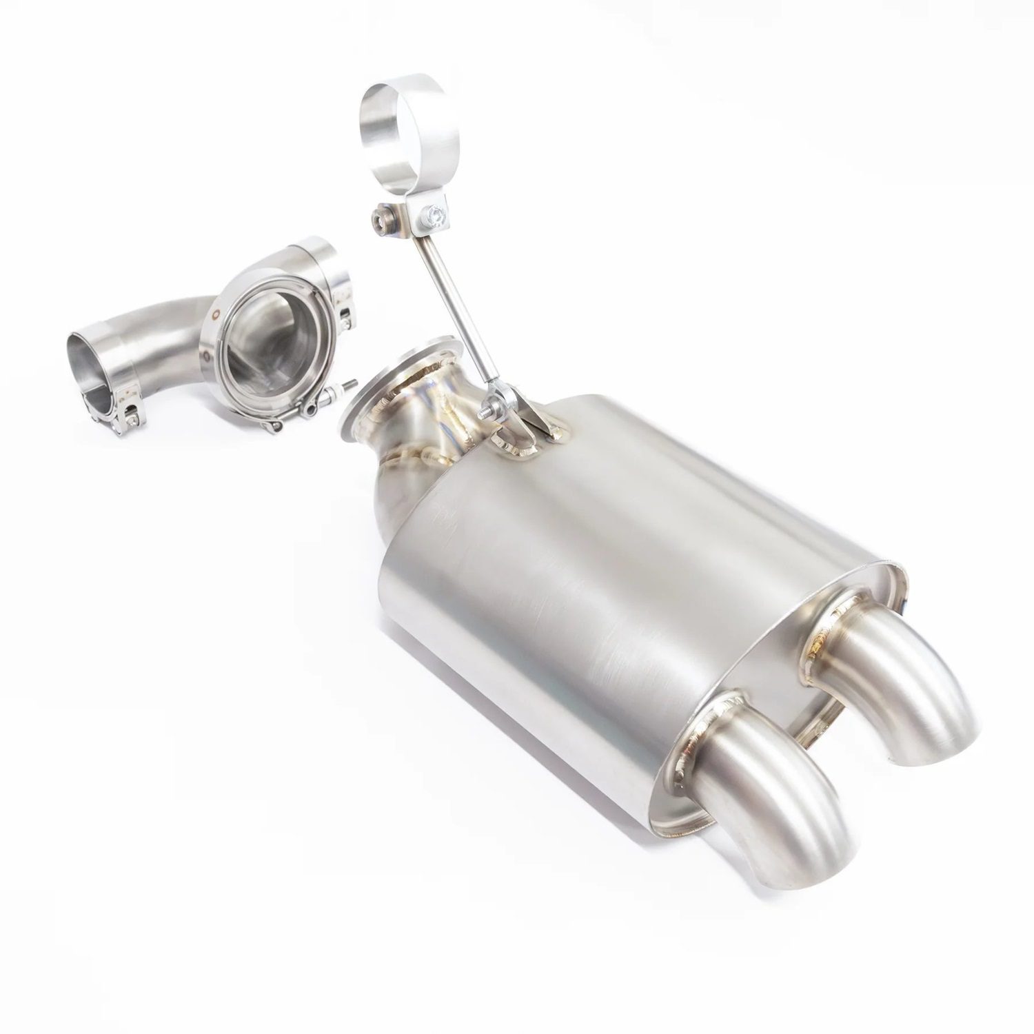 The JCR Titanium Silenced Exhaust Tip Assembly for the 981 Porsche Boxster Spyder and Cayman GT4 is a high-performance upgrade designed to enhance both sound and performance. Made from 100% titanium, this assembly significantly reduces weight compared to the OEM tips, improving vehicle dynamics. The silenced design lowers exhaust volume by 6dB, providing a refined, track-friendly sound without sacrificing power. Engineered for a direct replacement fit, installation is simple and requires no additional modifications. This assembly is perfect for enthusiasts seeking a balanced combination of performance and a more controlled exhaust note, ideal for both street and track use.