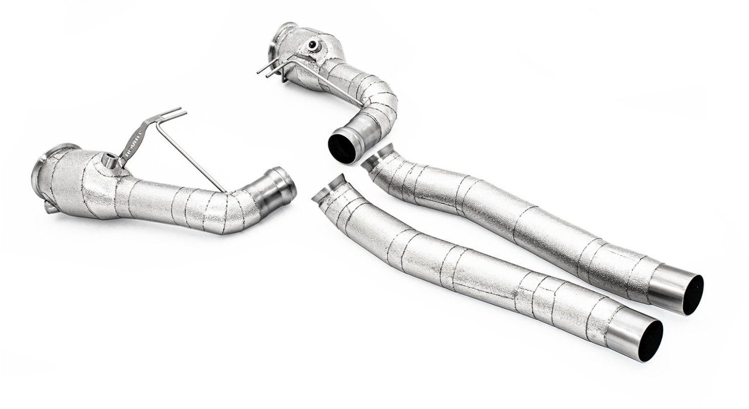The NOVITEC Sport Downpipes for the Ferrari 12Cilindri are made from high-grade stainless steel and feature sport metal catalysts, available with thermal insulation or optional 999 fine gold plating for enhanced heat protection and performance.
