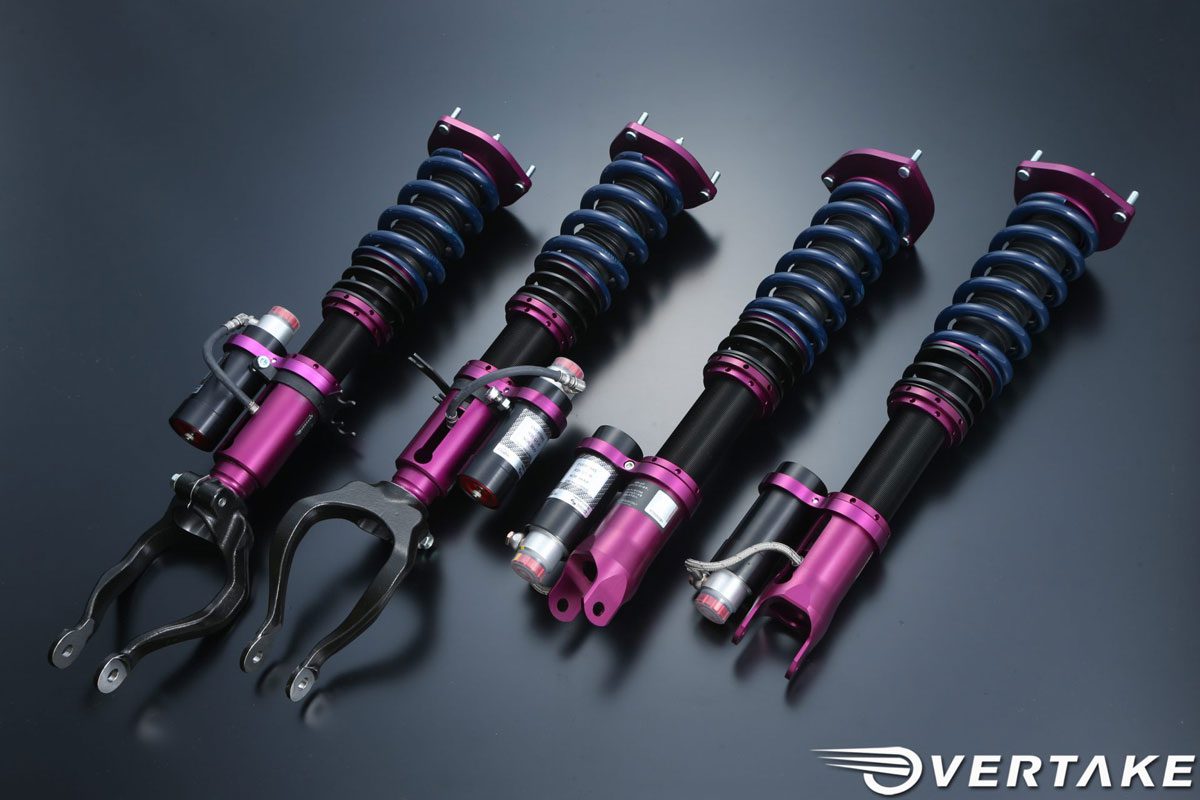 The Overtake suspension kit is a direct replacement of the OEM shock and spring sets (as proper motorsports-grade dampers with multiple adjustments, the Nissan electronics are not retained.) The dampers are produced completely from aluminum, which saves an impressive 14lbs (~6.5kg) over the OEM components.