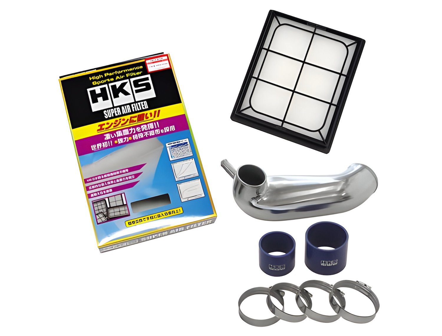 HKS Premium Suction Intake enhances engine aesthetics and performance with an aluminum pipe, 3-layered filter, and seamless stock system compatibility.