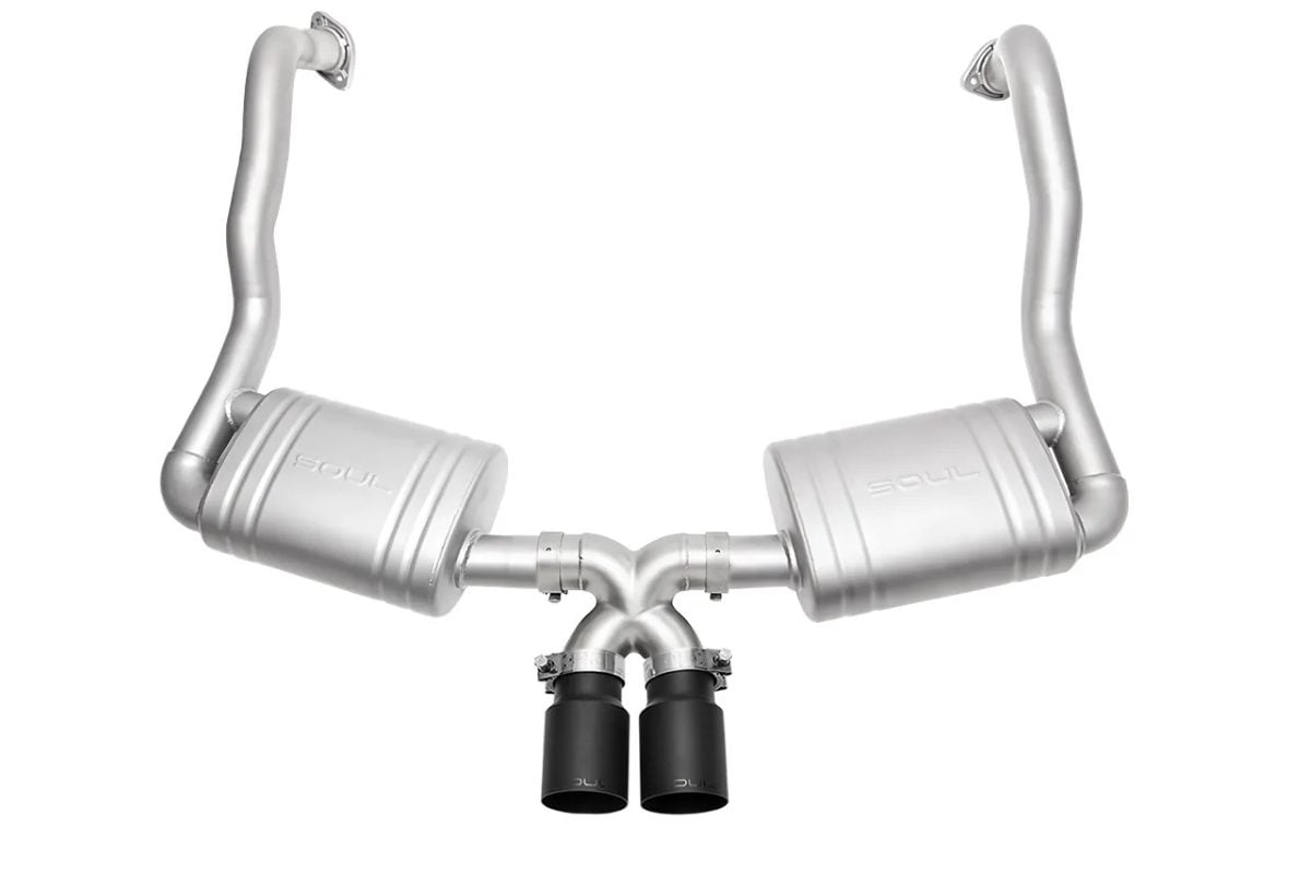 SOUL Performance Exhaust for the 981 Boxster/Cayman replaces the factory rear section with a free-flowing T304L stainless system and Satin Black slash-cut tips, delivering a deeper, sharper flat-six sound with minimal drone and a more purposeful rear appearance.
