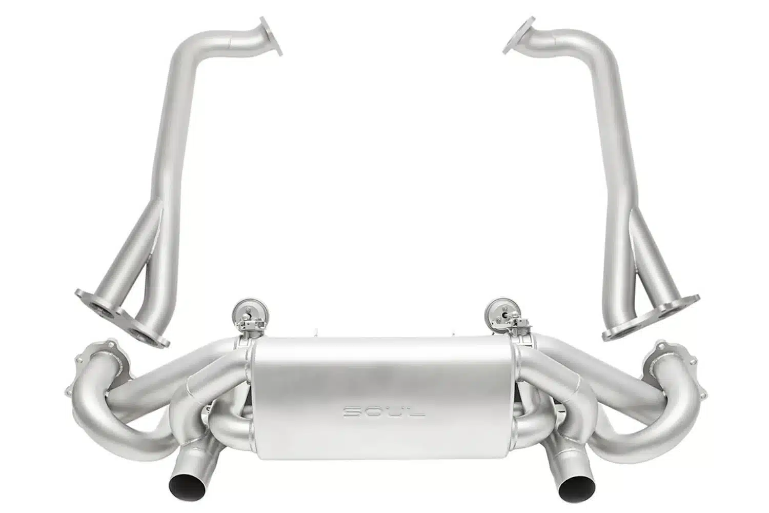 SOUL Performance’s 718 GT4 Clubsport Sport Package pairs a valved X-pipe exhaust with competition over-axle pipes and the required mounting kit to deliver a GT3-like tone, improved flow, and reduced exterior volume on demand. This configuration reuses OEM tips, includes a valve controller, saves about 11 lb, and is backed by a lifetime warranty.