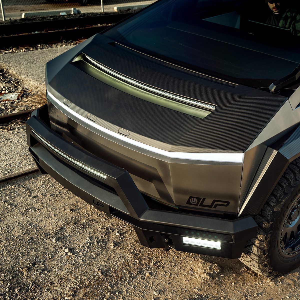 Additionally, the UP INVINCIBLE® Carbon Fiber Hood System is offered in gloss or matte UV clean finishes and includes 3 amber identification lights at the front end. While creating a striking presence at night, they are also a government mandate for vehicles over 80 inches, a bucket the Cybertruck falls into when UP INVINCIBLE® Wide Fender Flares are installed.