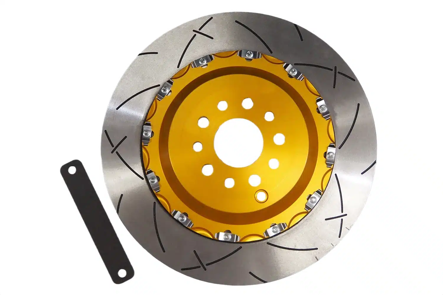 On 4BA GT-R NISMO and T-spec models, the yellow calipers are matched to large carbon-ceramic rotors, and the replacement cost is high enough that it can change how often you drive the car hard. TOP SECRET’s slotted 400mm rear 2-piece steel rotors are aimed at owners who want a practical steel alternative that works with the factory carbon-brake rear caliper package, whether you are moving away from carbon for budget reasons or building a yellow-caliper setup and want a more serviceable rotor option. The 400mm diameter maintains the correct large-rotor sizing for these cars, and the two-piece, slotted design is focused on staying stable under heat and repeated high-speed stops. It is a straightforward way to keep the GT-R’s braking system usable for real street miles and spirited driving without the ongoing expense of carbon rotors.